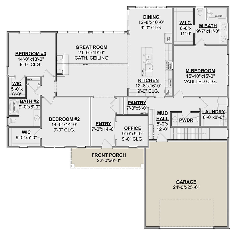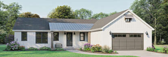 This exclusive Modern Lifestyle house plan delivers a resoundingly well-designed single-story home, complete with three bedrooms and two plus bathrooms. The attractive exterior showcases classic board and batten siding with natural column beams supporting the covered front porch. The traditional front-facing two-car garage will make it easy to drive into when you come home. The garage hosts plenty of space for vehicles and leads to the mudroom where you’ll easily be able to drop your coats, keys, and or packages before entering the home. This small area right off the garage also accesses the guest powder room, walk-in pantry, and the laundry room.