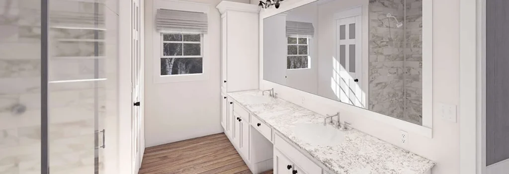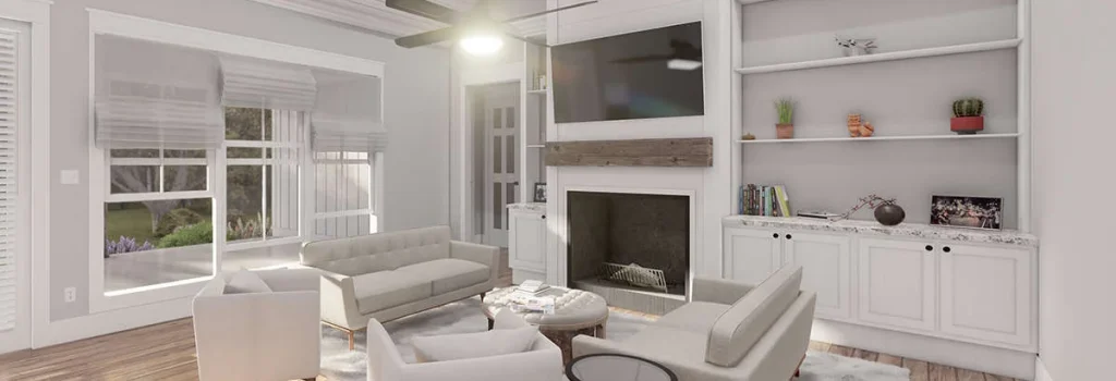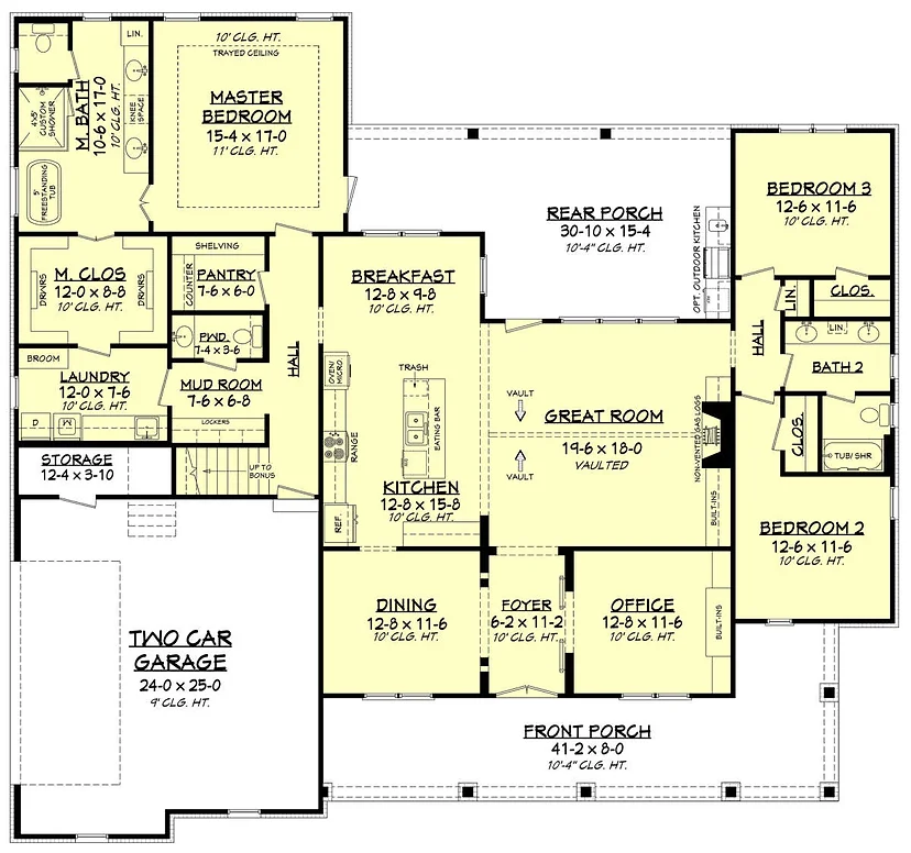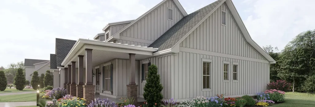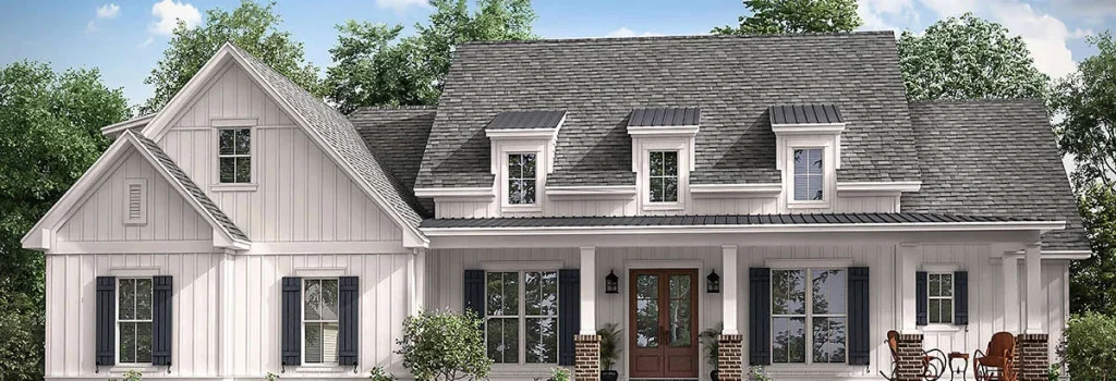 Simply outstanding in terms of architecture, this three-bedroom, three-plus bathroom modern home plan features approximately 2,570 square feet of living space. The exterior facade captures the ideal home for suburban living. From the board and batten siding, double gables, triple window dormers, and stacked brick accents, this home features exceedingly beautiful curb appeal. The extended front covered porch is a dream for those who love to greet their guests in style and is highlighted with successive columned beams, a small walk-up staircase, and double tuck around off the front section of the porch.